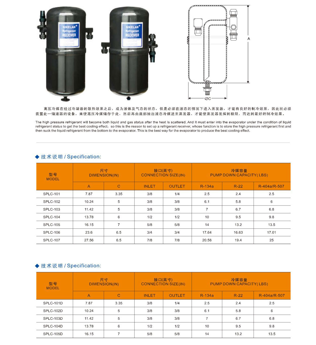 產(chǎn)品簡介:高壓冷媒在經(jīng)過冷凝器的散熱效果之后,成為液體及氣態(tài)的狀態(tài),但是必須在液態(tài)的情況下進入蒸發(fā)器,才能有良好的制冷效果,因此就必須裝置此一儲液器的設(shè)備,來使高壓冷媒儲存于此,然后再由底部抽出液態(tài)冷媒送至蒸發(fā)器,才能使蒸發(fā)器發(fā)揮到極限,而達到最好的制冷效果。