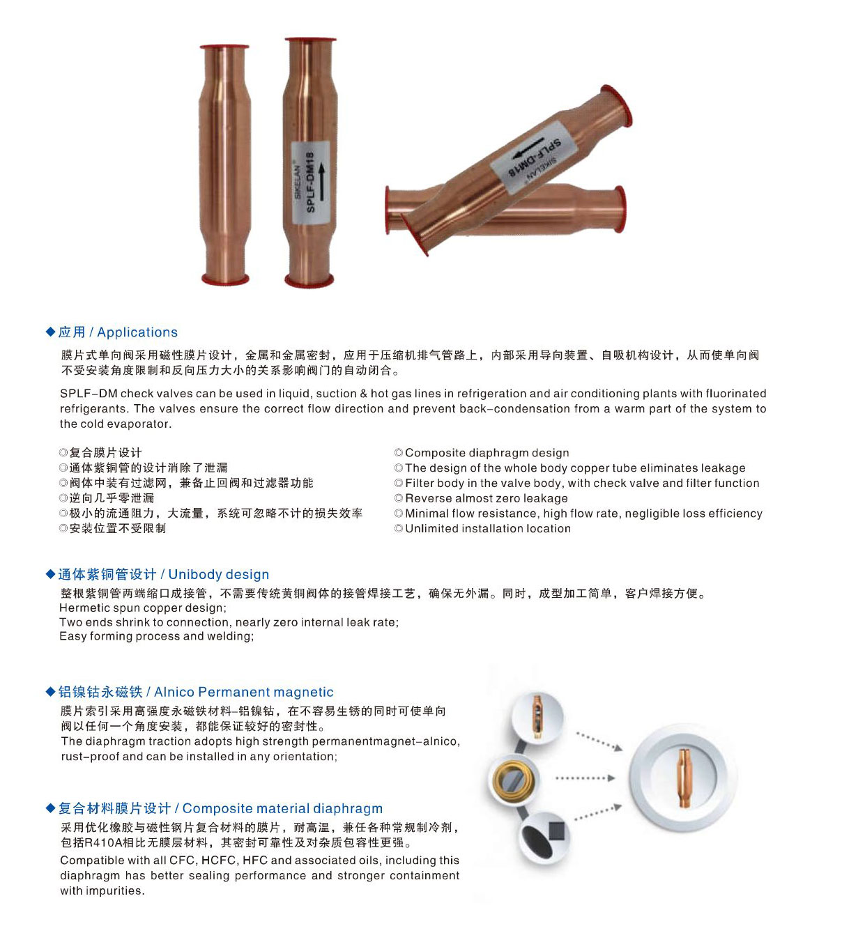 膜片式單向閥采用磁性膜片設(shè)計(jì),金屬和金屬密封,應(yīng)用于壓縮機(jī)排氣管路上,內(nèi)部采用導(dǎo)向裝置、自吸機(jī)構(gòu)設(shè)計(jì),從而使單向閥不受安裝角度限制和反向壓力大小的關(guān)系影響閥門的自動(dòng)閉合。