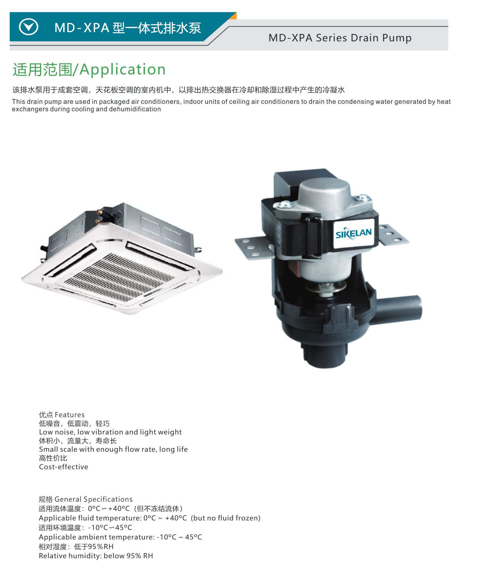 產(chǎn)品簡介:該排水泵用于成套空調(diào),天花板空調(diào)的室內(nèi)機中,以排出熱交換器在冷卻和除濕過程中產(chǎn)生的冷凝水
